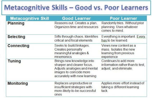 Metacognition is one’s ability to use prior knowledge to plan a strategy for approaching a learning task, take necessary steps to problem solve, reflect on and evaluate results, and modify one’s approach as needed. It helps learners choose the right cognitive tool for the task and plays a critical role in successful learning.